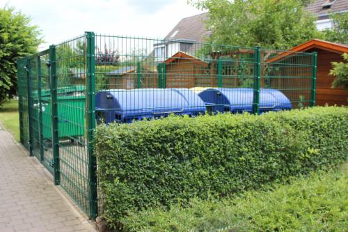 Müllplatz aus Doppelstabmatten, schwieriger Schnitt, vz und beschichtet RAL 6005 grün, Tür 1flg. LW 1,25m, 8/6/8,